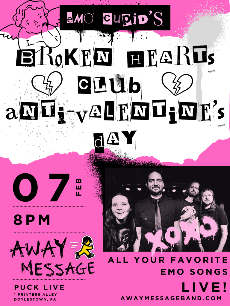 Away Message presents Emo Cupid’s Broken Hearts Club, the Anti-Valentine’s Day show for anyone who’s ever been ghosted, crushed, friend-zoned, or all three before February even started. Cupid’s arrows have been repossessed, the chocolates are expired, and we’re turning your heartbreak into a party. Come scream-sing (infidelities) while you ignore your running eyeliner.
